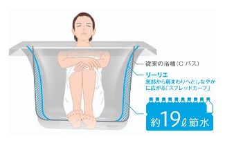 お風呂にはしっかり全身で浸かって、筋肉の凝りやストレスを取り除きたいもの。節水しつつ、くつろぎを感じやすいよう、浴槽内に「スプレッドカーブ」を採用しています。このスプレットカーブが約19Lの節水効果を生むのです。さらにその独特な曲線が、使い心地の良いヘッドレストとしても機能しています。やわらかなカーブに首をあずければ、リラックスしてお風呂を楽しむことができるでしょう。