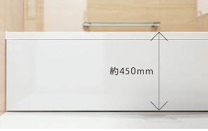 足を高くあげることが難しい、小さなお子様やお年寄りでも安心な、低めの浴槽またぎを採用しています。浴槽またぎの高さは約45cmと低めの設計。浴槽またぎに足をひっかけたり、浴槽に入るまでに時間がかかってしまったりという事態を防ぐので、安心して入浴可能です。