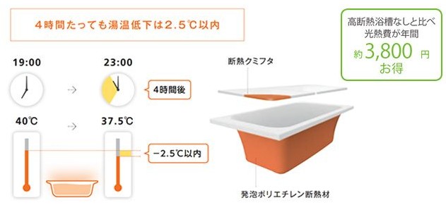 浴槽は、光熱費節約のために高い断熱性も保持しています。浴槽を発砲ポリエチレン断熱材で覆い、さらにフタも断熱クミフタを採用することで、抜群の保温性能を達成。湯わかし後4時間経過しても、湯温の低下は2.5℃以内と非常に優れた保温性能を発揮しています。夕食前にお風呂をわかし、食後にひと休みしてから入浴したとしても、お湯のあたたかさはそのままなので、追い炊きが必要ありません。さらに追い炊きの頻度を減らすことで、年間約3,800円の光熱費削減が見込めます。