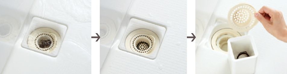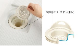 すっきりコンパクトな構造の排水口は、お掃除の邪魔になりがちな凹凸をなくしたことで、汚れにくくスムーズな洗い心地を実現しました。
