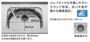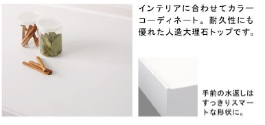 しっとりした質感の人造大理石製トップはインテリア性と丈夫さで定評があります。ステンレス製シンクは清掃性で定評があります。
