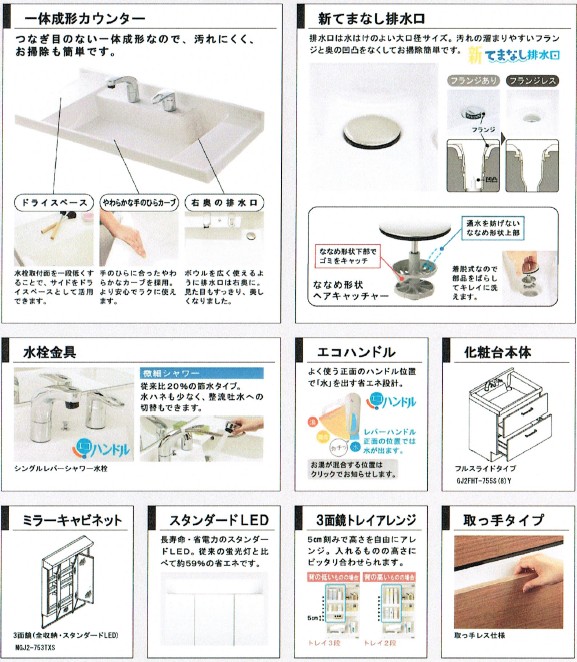 洗面化粧台の標準的なサイズが、間口750mmになります。サイズが大きすぎず、小さすぎず、使い勝手が良いサイズです。機能の充実性も優れています。