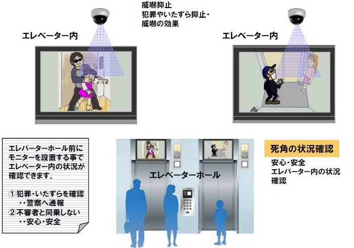 エレベーターかご内を24時間監視中・録画することで、ご利用者に安心感を与え、さらにステッカーをかご内や乗り場に掲示することにより、犯罪やイタズラに対する抑止効果を発揮します。
